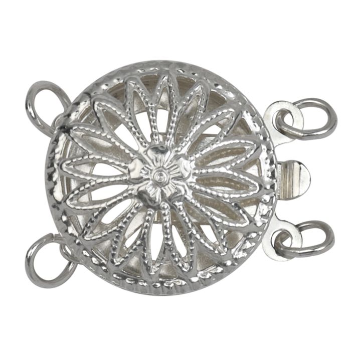 This series of round filigree clasp is the option for those needing a wider patterned clasp to end their beaded or pearl necklaces. Available in single, double or triple strand it uses a tongue to lock in place.