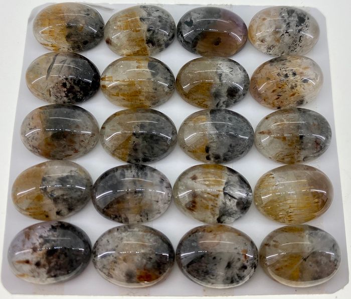 "Super seven" stone, also referred to as "Sacred seven" or "Melody stone", is a quartz stone that contains seven materials; goethite, cacoxenite, rutile, lepidocrocite, amethyst, clear quartz and smoky quartz. *please note all stones are sold separately, and not as a card.