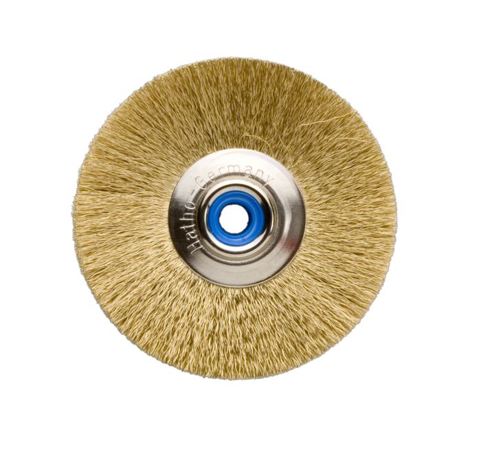 A brass wire brush designed for surface finishing in jewellery work and metal craft. This brush gives a softer satin or matt texture while being less aggressive than steel wire, making it suitable for gentler cleaning, deburring, or preparing surfaces for further finishing.