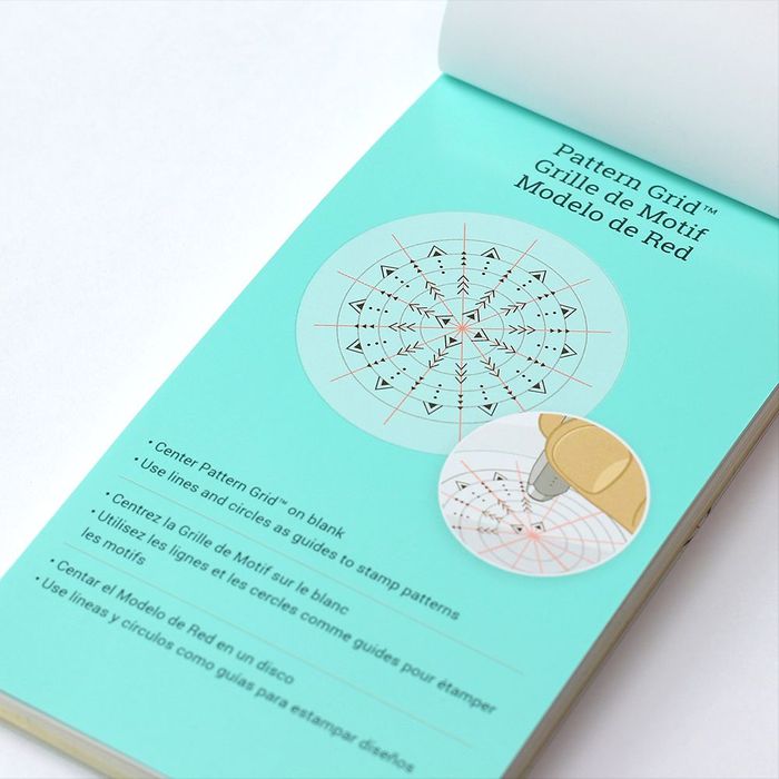 To use the Straight or Circle guides, simply stick a guide to your blank, line up your stamp with the spacing line, and stamp along the top ridge. To use the Pattern Grids, stick the transparent grid on your blank, and use the grid lines to stamp symmetrical patterns.