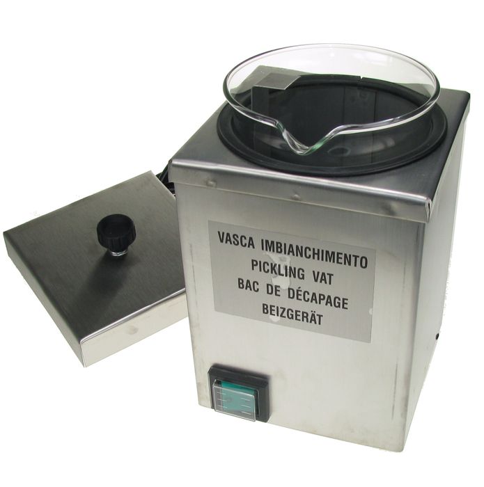 These Stainless Steel Electric Pickle Pots safely heat pickle to a preset 60 o C. The design of these units allow for removal a the internal glass beaker for cleaning or replacement. Remove oxidation and firescale from Gold, Silver and other non-ferrous metals.