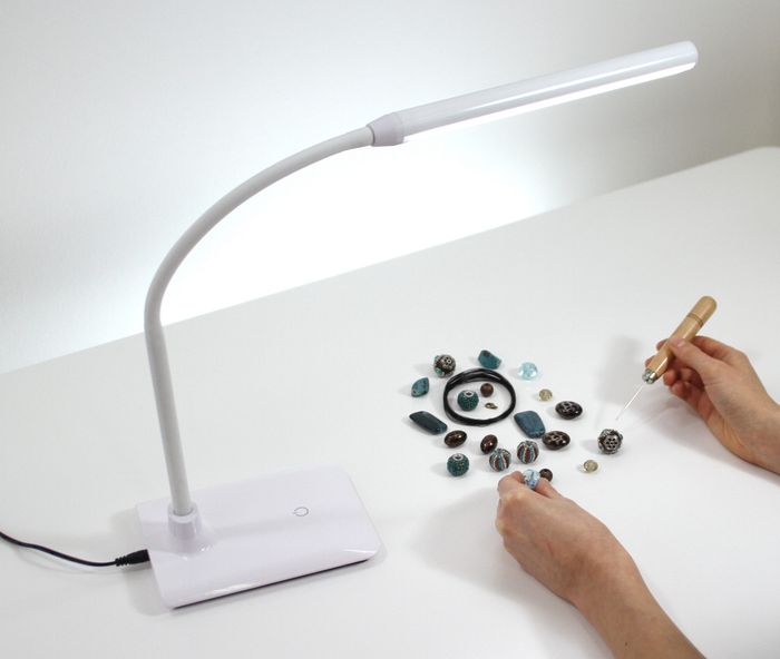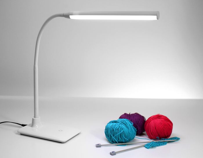 This slim, flexible table lamp has a modern design and sleek finish. It has 28 high performance, energy efficient daylight LEDs providing high light output over a large area. Ideally suited for art, craftwork, as well as reading.