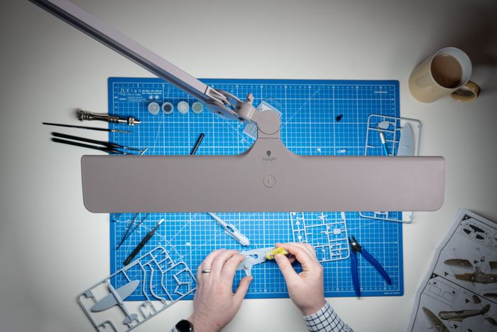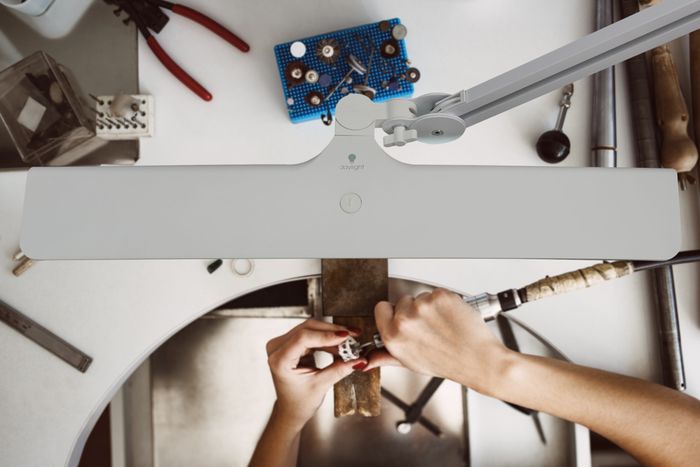 Ideal to use on any work space, cutting table, drafting table or desk, the Lumi is a professional workstation lamp that will enable you to see fine details and true colors. The large shade can be smoothly adjusted vertically, horizontally and laterally to any desired position. The dimmable light allows easy adjustment when less light is required.