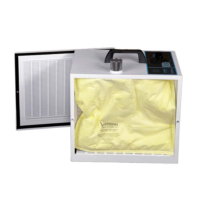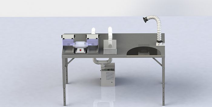 Designed for any production facility that is interested in promoting a dust, odor, and fume free environment. Two work-station dust collector with large accumulator