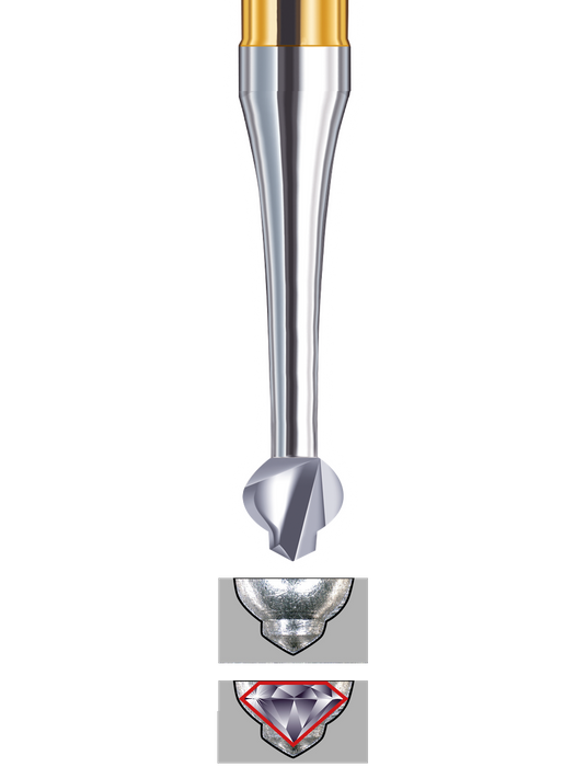 Its special feature is the combination of twist drill and round bur in a single tool. The PavéCut consolidates two work steps into one: predrilling with a twist drill and shaping and enlargement with a round bur. This saves time, increases precision and optimises the result.