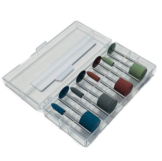 Synthetic rubber polishing set with various shapes. Flexible and long lasting polishing instruments for smoothing and high-shine polishing of precious and non-precious metals.