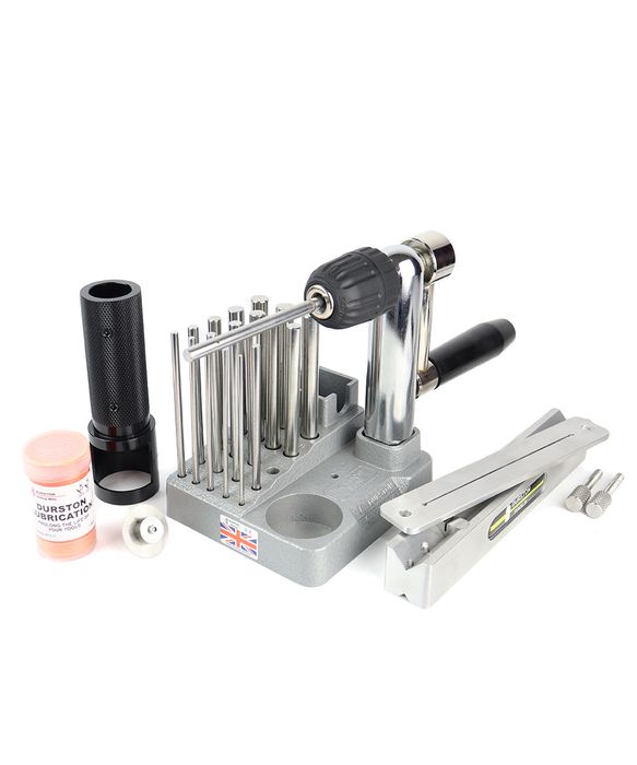 Durston Tools is proud to manufacture the most popular Ringer in the world that will suit both the Dremel Fortiflex and Foredom number 30 hand piece. The set includes a coil holder which is now part of the main base for the great stability, and a safety coil winder which can be moved and positioned anywhere on your bench. The increased mandrel length up to 120mm long and increased coil holder length both provide greater versatility. The high stem gives more room for your hands and is movable in a complete 360 degree circle. Its compact size of 220mm by 130mm by 180mm provides easy storage, and the total set weighs in at 6kg. Durston Tools’ lubricant and one blade are supplied as standard.