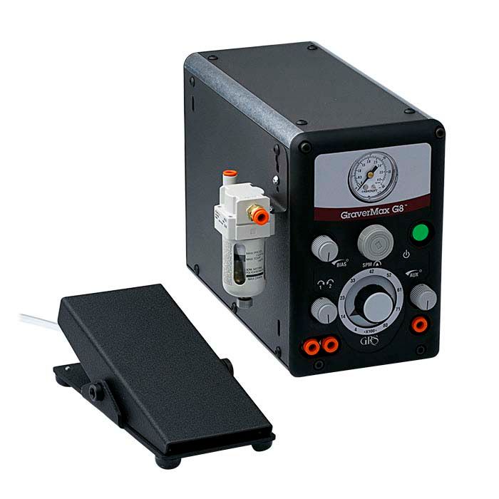 This engraving system gives each handpiece an excellent range of power with perfect control throughout an expanded range of impact speeds. The GraverMax G8 has connections for two impact handpieces and an auxiliary air connection for other air tools, including the GRS Ultra 850 Rotary handpiece. This system includes a foot control and air filter, and requires clean, oil-free compressed air with minimum 45 psi (3 bar) pressure and 1.4 cfm (40 liters per minute) flow. Electrical requirements are 100/240 V at 50/60 Hz. Stroke speed ranges from 400-8000 strokes per minute (SPM). Handpieces sold separately.