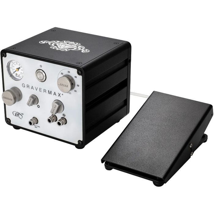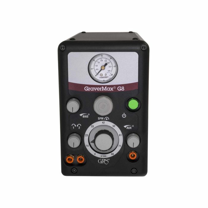 This engraving system gives each handpiece an excellent range of power with perfect control throughout an expanded range of impact speeds. The GraverMax G8 has connections for two impact handpieces and an auxiliary air connection for other air tools, including the GRS Ultra 850 Rotary handpiece. This system includes a foot control and air filter, and requires clean, oil-free compressed air with minimum 45 psi (3 bar) pressure and 1.4 cfm (40 liters per minute) flow. Electrical requirements are 100/240 V at 50/60 Hz. Stroke speed ranges from 400-8000 strokes per minute (SPM). Handpieces sold separately.