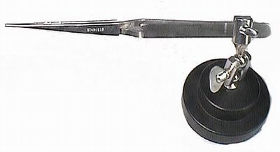 Soldering tweezers on a stand. Reverse action tweezers. Leaves both hands free for soldering.