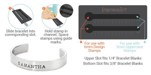 Slide bracelet into corresponding slot / Hold stamp in the channel. Space stamps using guide marks