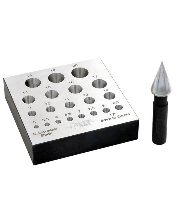 The Durston Round Bezel Block offers unparalleled precision for jewellers, featuring a comprehensive 5mm to 20mm size range with a 17° angle for superior round bezels.