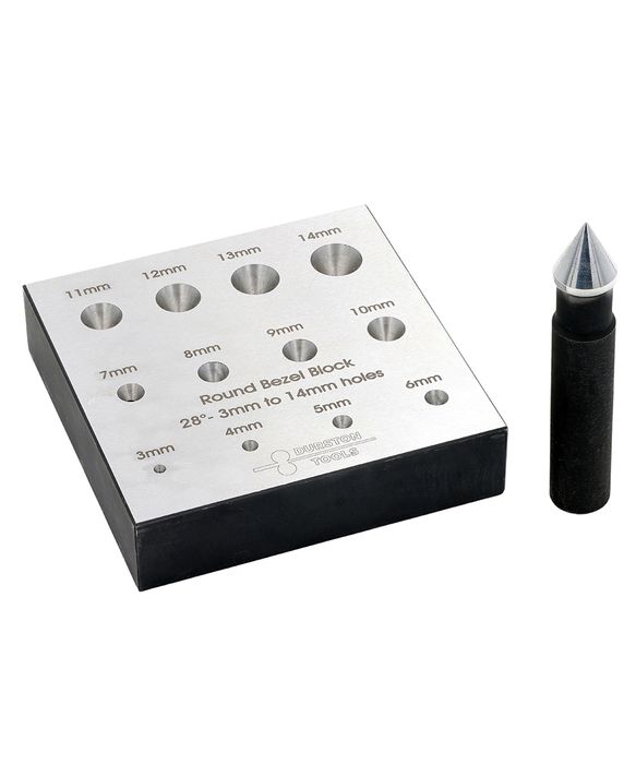 Designed for intricate bezel making, the Durston Round Bezel Block features a 3mm to 14mm size range with a 28° angle, ensuring detailed precision.