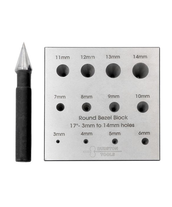 The Durston Round Bezel Block, designed for a 3mm to 14mm size range with a 17° angle, leverages precision ground, hardened, and polished steel to deliver unparalleled accuracy and quality for professional jewellers focusing on round bezel creation.