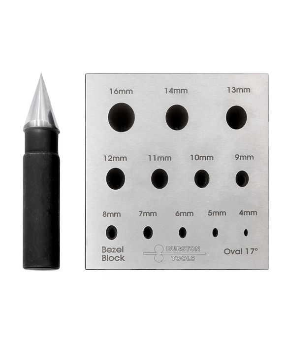 Expertly designed for the creation of oval bezels, the Durston Oval Bezel Block features a 4mm to 16mm size range and a 17° angle, made from precision ground, hardened, and polished steel to ensure the highest standards of quality and precision for professional jewellers.