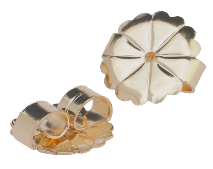 The butterflies with widest base diameter in our range, it has a flower design with grooves from the centre hole to the scalloped outer edge forming the petals. They fit earring posts up to 1mm diameter and they don't have very large scrolls so you won't have to worry about your earring posts being too short.