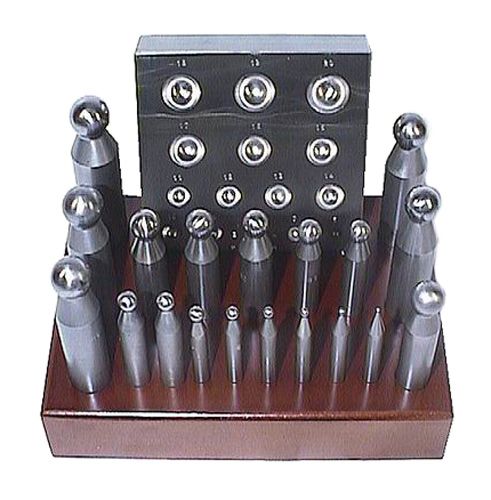 Doming block and punch set mounted on wooden base. Set of 19 punches from 2 - 20mm, with 19 hole dapping plate from 2 - 20mm.