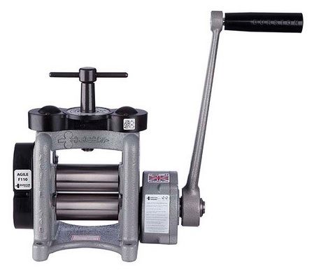 Durston's Agile F110 rolling mill is for the budget concious who still demand quality. The F110 is a lighter-weight, more affordable mill available to every jeweller without sacrificing any operational efficiency or the fine quality results you expect from a Durston mill. A T-bar replaces the usual hand-wheel, the rollers are specially induction-hardened to 64 HRC (to a depth of 6mm on the main barrel) for a lifetime of service, and the bearing blocks are fully supported for the best possible finish on your rolled metal. The rollers offer a generous flat area.The mill features a gear box with no extension rollers.