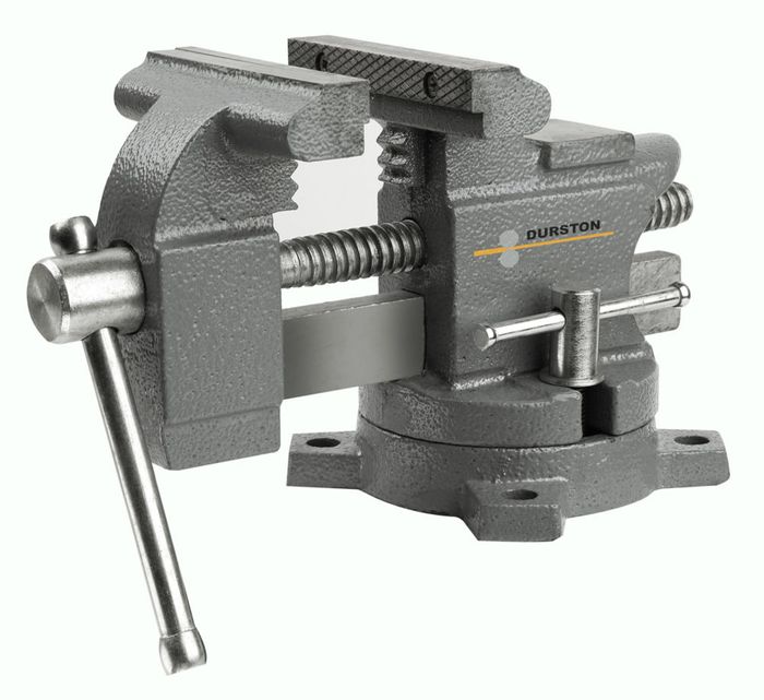 The new Durston Large Bench Vice will securely hold your work whilst allowing you to swivel the base as required, a full 360°. Lock the vice into place by sliding the T handle, loosen and tighten the jaws by turning the easy access body handle. The body is powder coated cast iron for strength and stability and also ensuring a long service life. The base is also pre-drilled with four countersunk holes for mounting to your work surface.