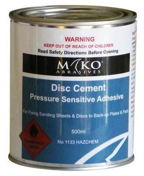 Mako Disc cement is a pressure sensitive adhesive used for fixing sand paper sheets and discs to backing plates and pads.