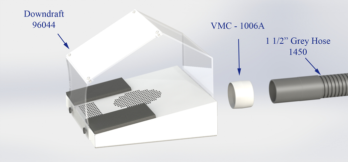 The Downdraft is a bench-top dust collection accessory that creates a semi-enclosed dust collection area when using hand pieces. It features a removable protective shield, padded wrist rests, vent selection, and a padded catch tray. Made from durable Plexiglass and steel.