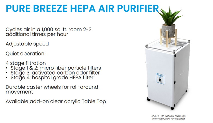 The Pure Breeze HEPA Air Purifier is a portable air purifier that scrubs the air of dust, chemicals, and biological hazards. This laboratory grade HEPA air cleaner is extremely quiet and ideal for many different air filtration applications. It scrubs the air and filters microbes, dust, particulates, fumes, odors, and vapors thanks to a 4 stage filtration system. This unit is half the price and size of comparable industrial air purifiers and is made is USA.