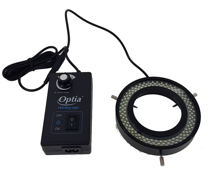 With natural spectrum light and adjustable intensity, this LED ring light is easily added to most microscopes using the three adjustable threads.
