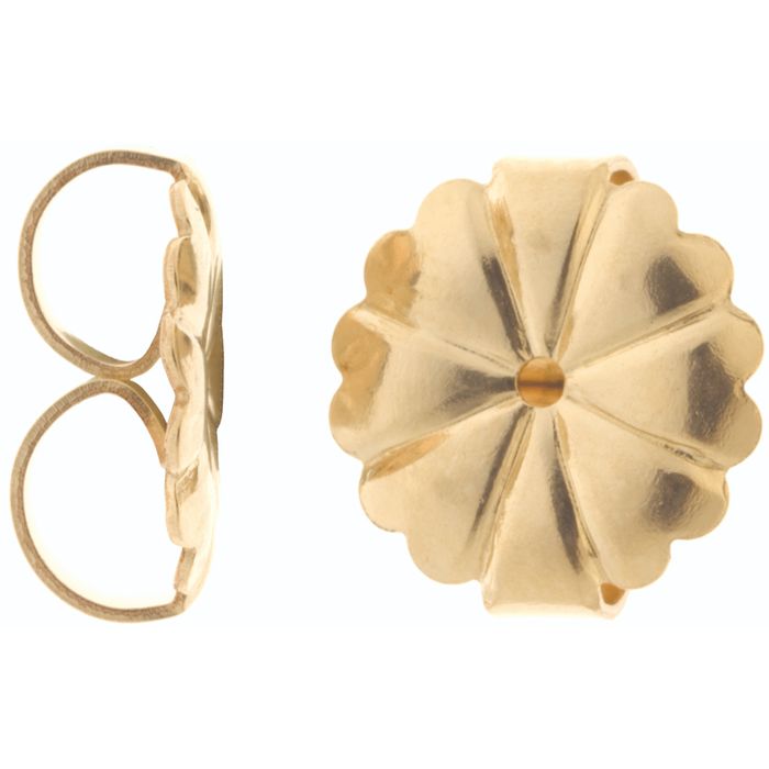 The butterflies with widest base diameter in our range, it has a flower design with curved grooves from the centre hole to the scalloped outer edge forming the petals. They fit earring posts up to 0.95mm diameter and they don't have very large scrolls so you won't have to worry about your earring posts being too short.