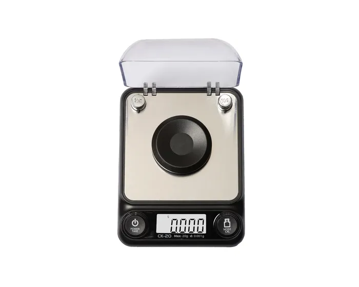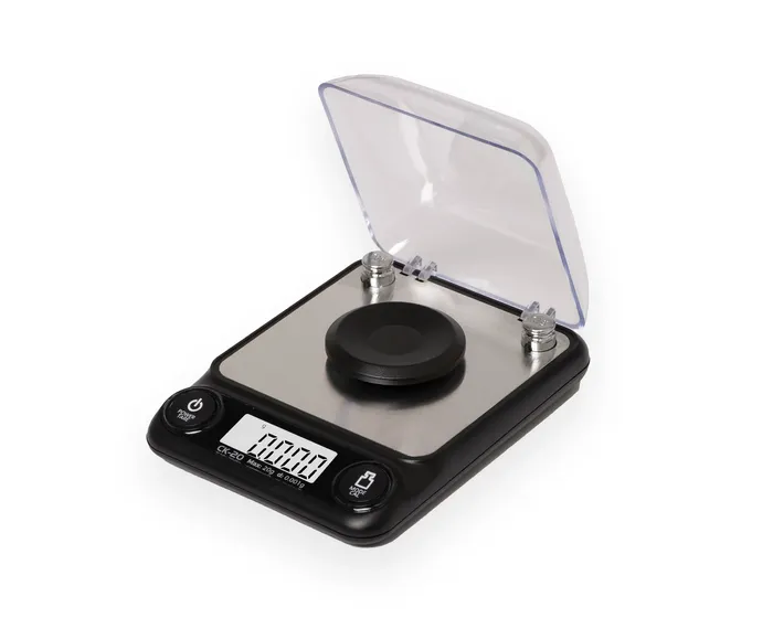 The CK digital milligram scale features a compact design with built-in draft shield/cover. The high precision sensor allows the scale to weigh up to a maximum of 20 grams with display readability of 0.001g (1mg). Results are easy to read on the white, back-lit LCD in any lighting condition. Built-in overload protection helps prevent damage to the scale. Other features include programmable Auto-Off after 30/60/90/180 seconds of inactivity, Tare/Zero feature for subtracting the weight of a container or expansion tray, and easy one-touch calibration.