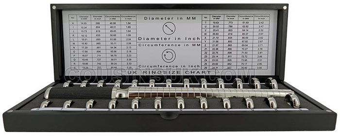 Features 25 individual plated rings 4mm wide from H to Z+6 plus a multi size aluminium ring gauge all set into a black foam inlay with shaped recesses.