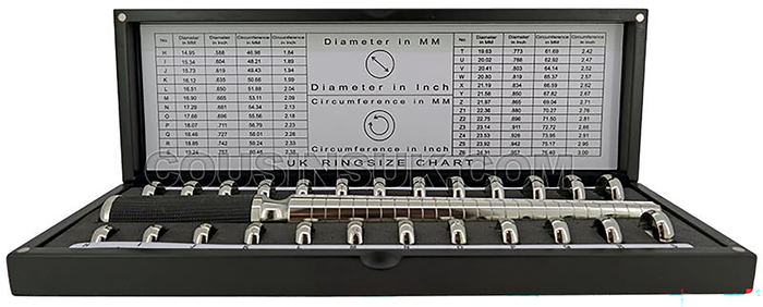 The aluminium Ring Gauge has 4 different size markings British A to Z+6 in half sizes, Diameter 12 to 25mm in quarter mm steps plus Circumference 40 to 78mm.