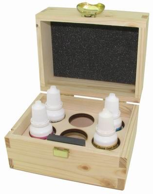 Presented in a polished wood box, the AJS Acid Test Kit contains one each 9ct, 14ct, 18ct and 22ct test acids, Test Stone and Instructions.
